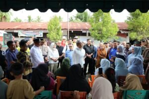 SIABU(Malintangpos Online):Bupati Mandailing Natal (Madina) H. Saipullah Nasution dan Wakil Bupati Atika Azmi Utammi Nasution, mendampingi Menteri Koordinator Pangan Zulkifli Hasan dan Menteri UMKM Maman Abdurrahman menyalurkan bantuan bagi warga terdampak bencana banjir yang mengungsi di SDN 037 Tanggabosi, Kecamatan Siabu, pada Kamis, 4 Desember 2025.