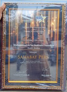 PANYABUNGAN(Malintangpos Online): Bupati Mandailing Natal, H.M Ja’far Sukhairi Nasution, menerima piagam penghargaan beserta Piala Sahabat Pers 2022 dari Serikat Perusahaan Pers (SPS) Sumatera Utara.