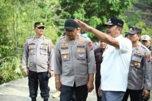 Bupati Mandailing Natal (Madina) H. Saipullah Nasution bersama Kapolres Madina AKBP Arie Sofandi Paloh meninjau lokasi longsor yang memutus total akses jalan menuju Desa Banjar Melayu, Kecamatan Batang Natal, Jumat (5/12/2025).