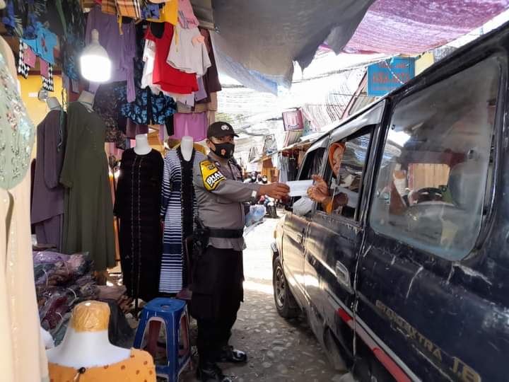 PANYABUNGAN(Malintangpos Online): Bhabinkamtibmas Kelurahan Pasar Baru Sipolu-polu, Brigadir Nahbatul Fikar melaksanakan penyuluhan, imbauan dan edukasi protokol kesehatan sekaligus membagikan masker kepada masyarakat.