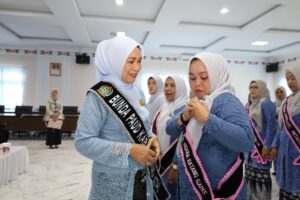 Pengukuhan ditandai dengan pemasangan selempang. Ny. Yupri Astuti kemudian mengukuhkan bunda PAUD tingkat kecamatan dan kelompok kerja (Pokja).