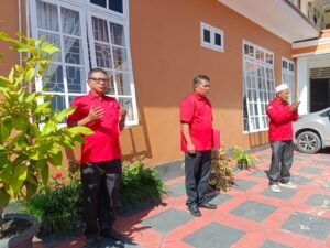 PANYABUNGAN(Malintangpos Online): Ketua DPC .PDI Perjuangan Madina Teguh W Hasahatan Nasution,menjadi Inspektur Upacara Peringatan Hari Lahir Pancasila 1 Juni 1945, yange Ke – 80 di samping Kantor DPC.PDI Perjuangan Kel Dalan Lidang Panyabungan, Minggu(1/6) yg berlangsung dengan sukses.