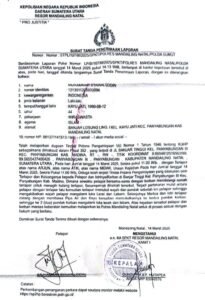 Sebagaimana dimuat dalam Surat Tanda Penerimaan Laporan (STPL) Nomor : STPL/107/III/2025/SPKT/POLRES MANDAILING NATAL/POLDA SUMUT, Tanggal 14 Maret 2025, M Syawaluddin telah melaporkan suatu tindak pidana penganiayaan secara bersama terhadap istrinya, di Kelurahan Panyabungan III.