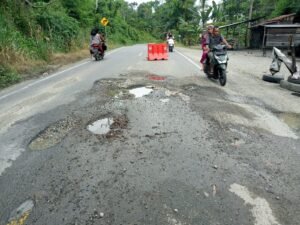 Jalan Lintas Sumatera tepatnya di wilayah perbatasan Desa Hutaraja dengan Desa Sibaruang itu dalam beberapa hari terakhir, sedikitnya empat pengendara sepeda motor mengalami kecelakaan tunggal saat melintasi ruas jalan yang dipenuhi lubang tersebut.