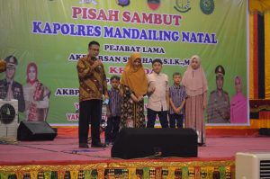 “Pas tadi masuk ke perbatasan, kami merasa bahagia, Kami mengabdi disini untuk bersama sama masyarakat menjaga Kamtibmas dan kondusifitas, Kami mohon dukungan dan doa restu dari semua lapisan masyarakat agar kami dapat menjalankan tugas dan melayani, melindungi, dan mengayomi masyarakat, Niat kami tulus memberikan pengabdian, semoga ini jadi catatan amal kebaikan bagi kita semua,” ujar Kapolres Madina AKBP.Horas Tua Sillahi,S.IK.M.Si yang didampingi istri dan putra/putrinya.