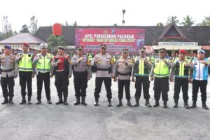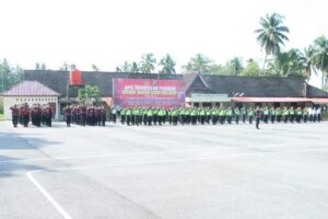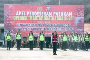 PANYABUNGAN(Malintangpos Online): Apel pergeseran pasukan Pengamanan (PAM) Pemilu 14 Februari Tahun 2024 selesai dilakukan oleh Polres Mandailing Natal, Senin (12/2/2024).