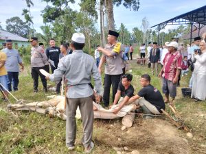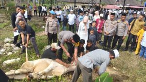 Dengan lantunan ” Allohu Akbar.. Allohu Akbar..Allohu Akbar.. ” secara perlahan Kapolres yang didampingi Istri dan anaknya menyembelih sendiri Qurban yang memang Qurban keluarganya.