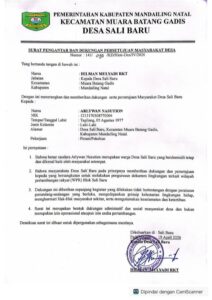 Dari sisi administratif dan sosial, langkah ini turut diperkuat oleh dukungan Pemerintah Desa Sali Baru melalui Surat Pengantar Dukungan Persetujuan Masyarakat Desa Nomor: 141/090/KD/RKM-DES/IV/2026 Tanggal: 19 April 2026.