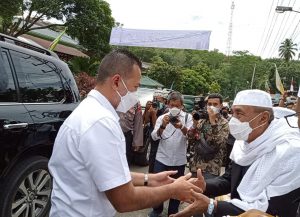 Rombongan Menteri BUMN Erick Thohir dan Wagubsu Musa Rajeckshah sekitar 12.45 Wib didepan Ponpes langsung disambut Mudir H.Musthafa Bakri Nasution dan sejumlah guru Ponpes dan Mudir memberikan Serban dan Lobe ke Erick Thohir dan Menteri Perdagangan.