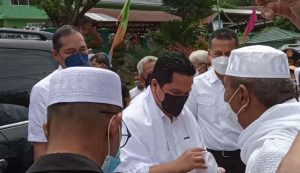 KEDATANGAN Menteri BUMN Erick Thohir dan rombongan Sabtu 26 Juni 2021 sekitar pukul 12.30 Wib sudah mendarat di Lapangan Komfi B Yonif 123/RW Manggadua Desa Parbangunan Kec.Panyabungan Kabupaten Mandailing Natal.
