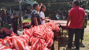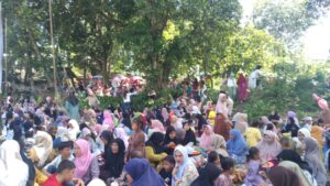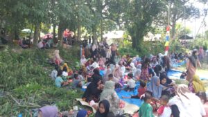 Tampak berbagai hidangan disajikan di bawah hamparan tenda yang tersusun rapi. Suasana kebersamaan terlihat hangat ketika seluruh warga, mulai dari anak-anak hingga orang tua, duduk bersila menikmati hasil bumi bersama-sama.