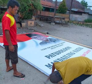 Pendirian baliho di Halaman Bolak Sopo Godang Kotasiantar, Kelurahan Kotasiantar, Panyabungan, Mandailing Natal, itu dilakukan oleh 10-an orang.