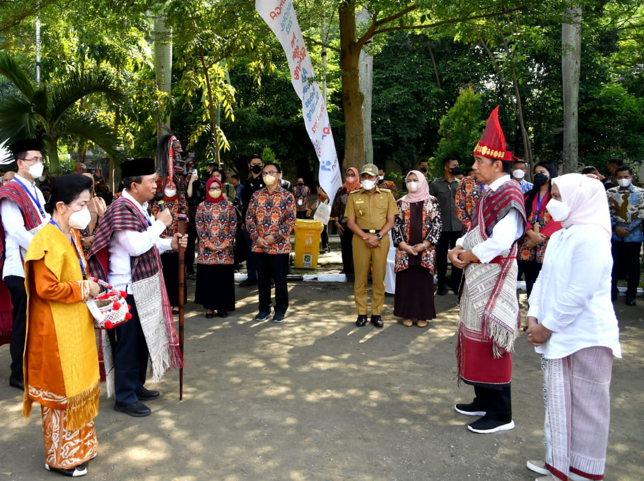 Didampingi Ibu Iriana Joko Widodo, Presiden Jokowi yang tiba sekitar pukul 09.30 WIB tampak menggunakan pakaian adat etnis Sumatera Utara, yaitu Baju Adat Toba.