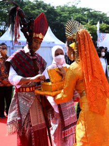 Setelahnya, Presiden dan Ibu Iriana mengikuti prosesi tradisi adat Batak Toba. Presiden diberikan tongkat ‘Balehat Raja’ yang memiliki arti sebagai lambang kekuatan Presiden Jokowi dalam menjalankan kepemimpinan di Tanah Air.