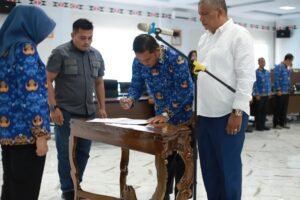 Serah terima jabatan berlangsung di Aula Kantor Bupati Madina, Kompleks Perkantoran Payaloting Panyabungan, Kamis, 17 Juli 2025.