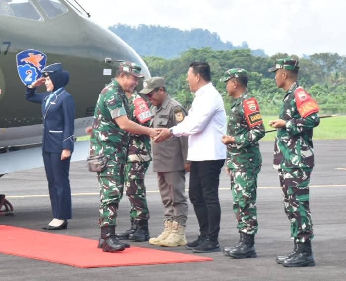 SIBOLGA(Malintangpos Online): Wakil Wali Kota Sibolga, Pantas Maruba Lumban Tobing, didampingi unsur Forkopimda Sibolga–Tapanuli Tengah, Staf Ahli Bidang Pemerintahan, Hukum dan Politik Sekretariat Daerah Kota Sibolga, Bustanul Arifin, S.T., M.M., Staf Ahli Bidang Ekonomi, Keuangan dan Pembangunan Sekretariat Daerah Kota Sibolga, Drs. Rudolf S. Butar-butar, M.Pd., serta Plt. Kepala Dinas Perikanan, Ketahanan Pangan dan Pertanian Kota Sibolga, Julius Haloho, S.Pi., M.M., menyambut kedatangan Kepala Staf Angkatan Darat (KASAD), Jenderal TNI Maruli Simanjuntak, M.Sc.